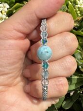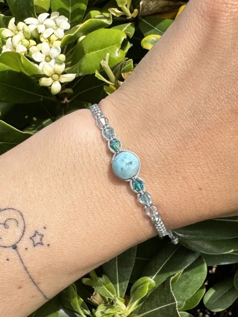 Výraznější. Zářivější. Nepřehlédnutelný. Larimar doplněný o jemné, křišťálové, speciálně vybrousené korálky, které zachytí světlo při každém pohybu. Mohutnější macramé řemínek dodává Larimaru pevnost a sílu. Není to jen šperk. Je to pocit, když se chceš cítit krásná, ženská… a taky výjimečná. Každý detail je tvořený ručně. Každý kus je originál. Přemýšlej o tom, jestli to není ten, který tě vystihuje nejvíc.