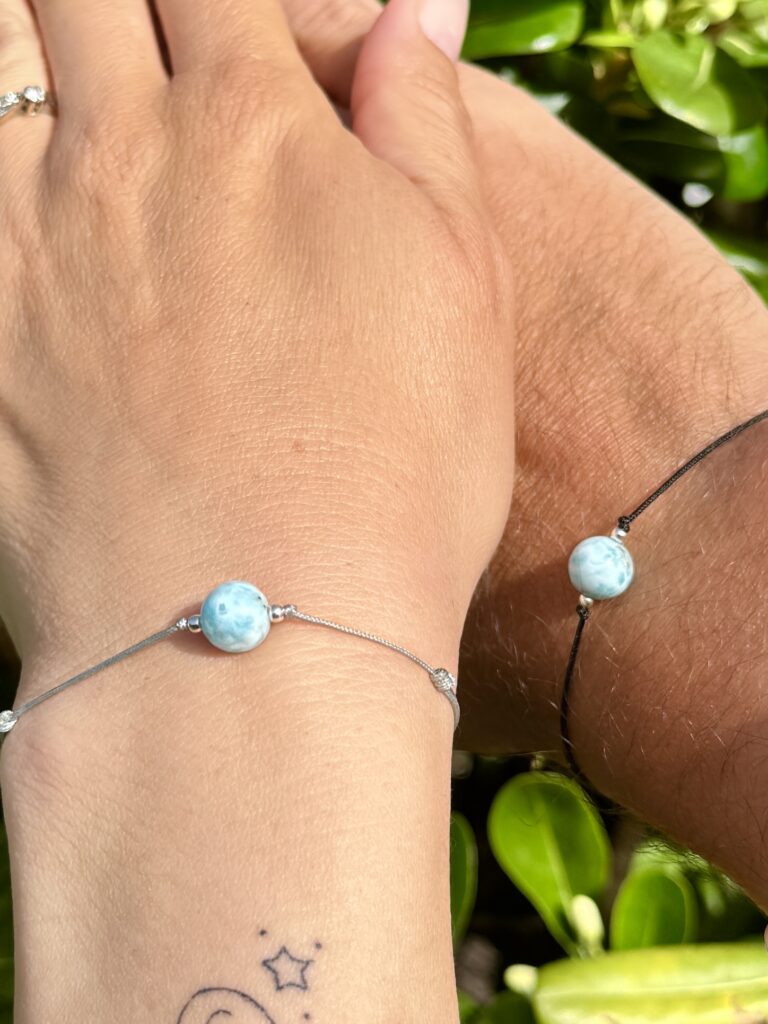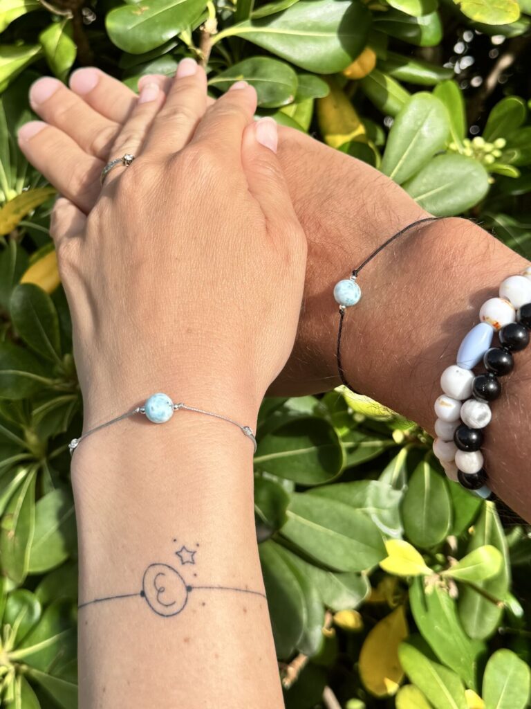 va náramky. Jeden příběh. Každý z vás nosí svůj vlastní kousek… a přesto vás něco spojuje. Jednoduchý Larimar. Čistý. Opravdový. Stejně jako to, co je mezi vámi. Na dálku i na blízko. Možná je to ten malý symbol, který má větší význam, než se na první pohled zdá.